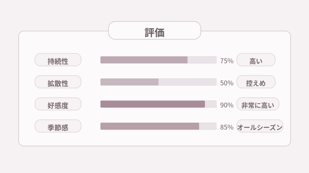 ◎:「肌なじみがよくて包み込まれるような感じ」「つけ始めより時間が経ってからの方が好き」「オードトワレなのに持ちがいい」「オフィスでも夜でも使いやすい」といった声が多く見られます。ドライダウン後に本領を発揮する香りで、清潔感とほんのりした温かみのバランスが支持されています。